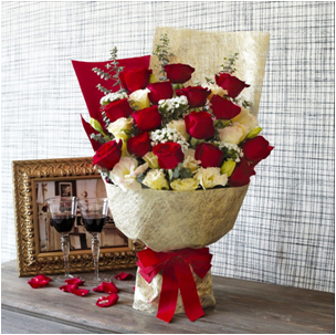 FB9915 ... 15 Red roses as decoration with lisianthus &gypsophila (baby's breath), In a special style for special people of you.